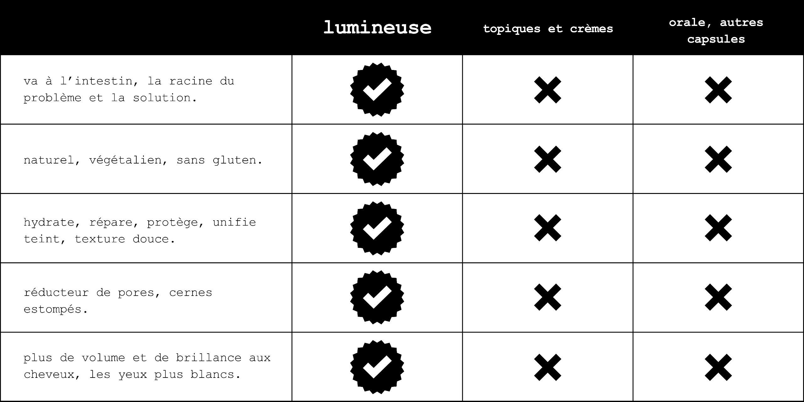 nous avons cherché différents types d’ingrédients naturels, vitamines minérales, algues et probiotiques avec l’équivalence exacte aux bénéfices que la peau obtient grâce à l’eau de mer.avec lumineuse, ces bénéfices viendront depuis l’intérieur du corps et avec chaque régénération de la peau. c'est-à -dire, des cycles de 28 jours.