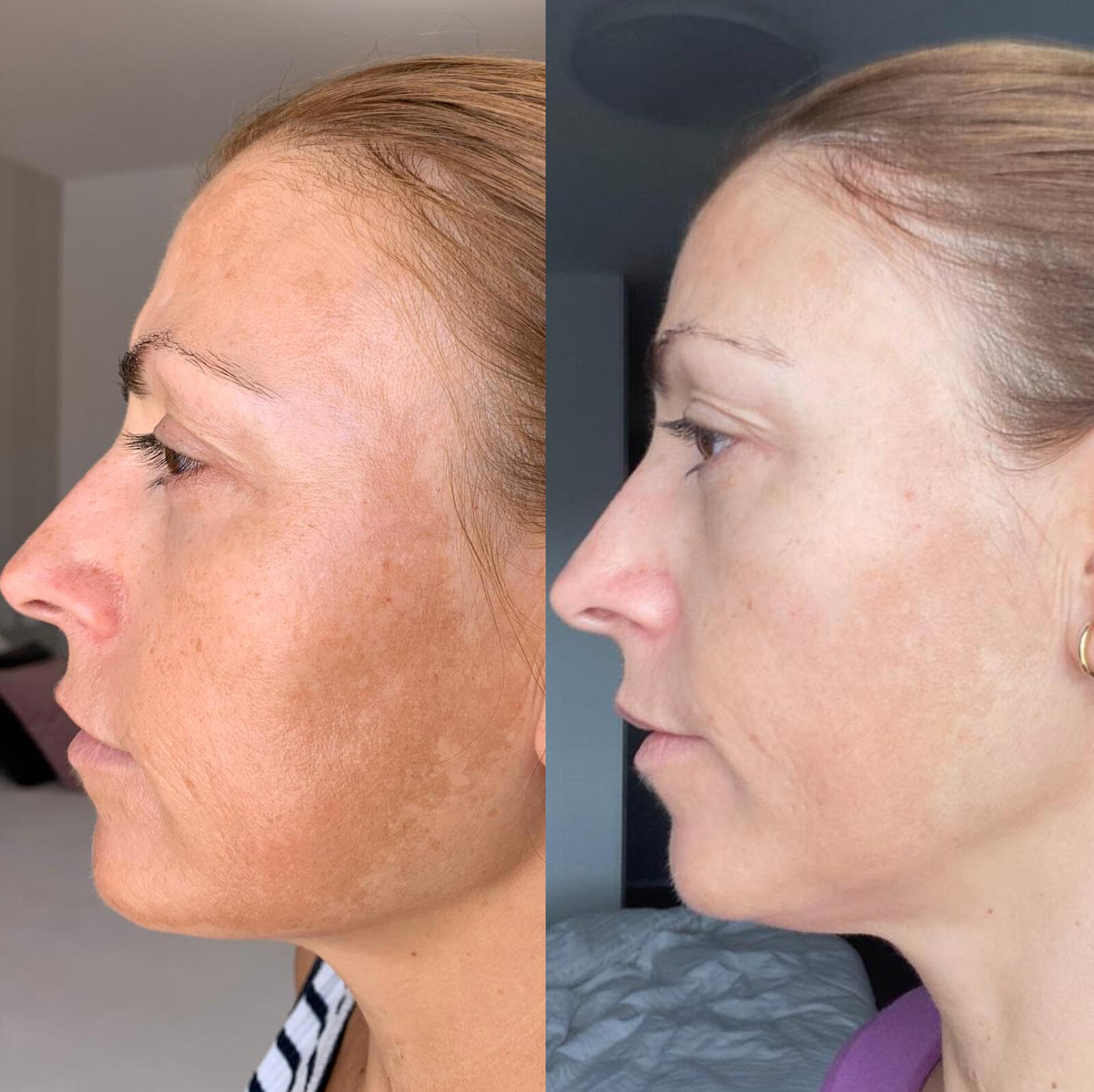 sécheresse et taches.40 jours avec lumière. la peau est plus claire, plus lisse et les taches beaucoup moins accentuées.la texture de la peau s’est améliorée, la tendance à la sécheresse ne se remarque plus et je n’ai plus besoin d’utiliser autant de crèmes.donc je suis très heureuse de ce produit.